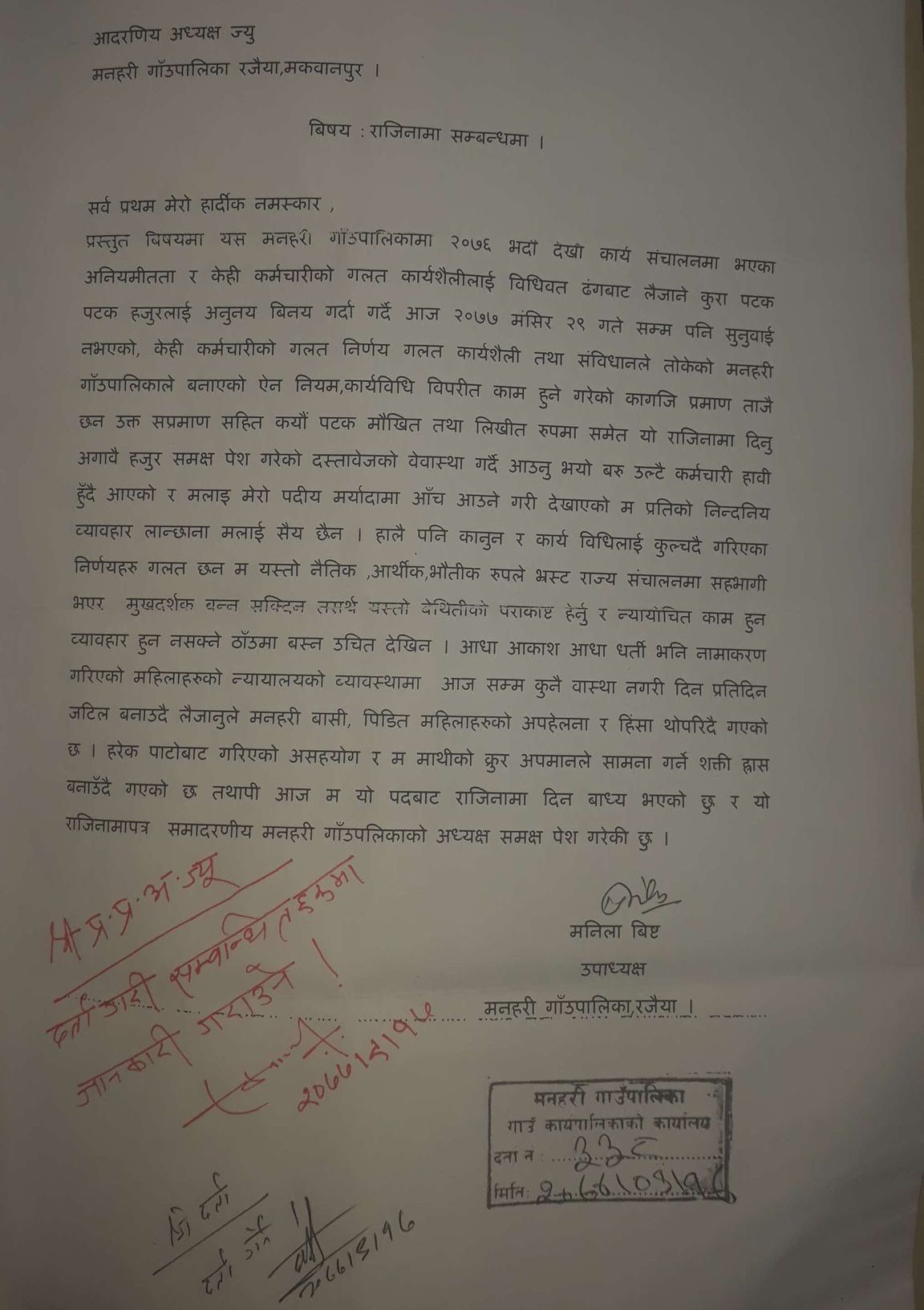 मनहरी गाउँपालिकी उपाध्यक्ष मनिला विष्टले आफुले उपाध्यक्ष पदबाट राजीनामा नदिएको भन्दै हेटौंडामा पत्रकार सम्मेलन गरिरहँदा उनले अध्यक्ष एकराज उप्रेती समक्ष दिएको राजीनामा पत्र नै सार्वजनिक भएको छ । उपाध्यक्ष विष्टले दिएको राजीनामा गाउँपालिकाको बैठकले स्विकृत गरेको समाचार आएपछि आइतबार साँझ उनले हेटौंडामा पत्रकार सम्मेलन गर्दै आफुले राजीनामा नदिएको बताएकी थिइन् । उनले पत्रकार सम्मेलनमा भनिन्–‘ मैले पदबाट राजीनामा दिएको छैन । गाउँपालिकामा मेरो नाममा कुनै राजीनामा पत्र पुगेको रहेछ भनेपनि त्यो फेक हो । कर्मचारीको बदमासी हो ।’