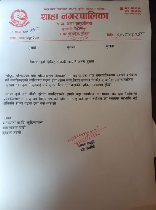 कोरोना कहरबीच थाहा नगरपालिकामा घटना दर्ता शिविर सञ्चालन हुने भएको छ । थाहा नगरपालिकाको वडा नम्बर १ कार्यालयले २८ जेठमा एक सूचना जारी गर्दै आगामी १ र २  असारमा वडाका विभिन्न तीन स्थानमा घटना दर्ता शिविर सञ्चालन गर्ने जनाइएको छ ।