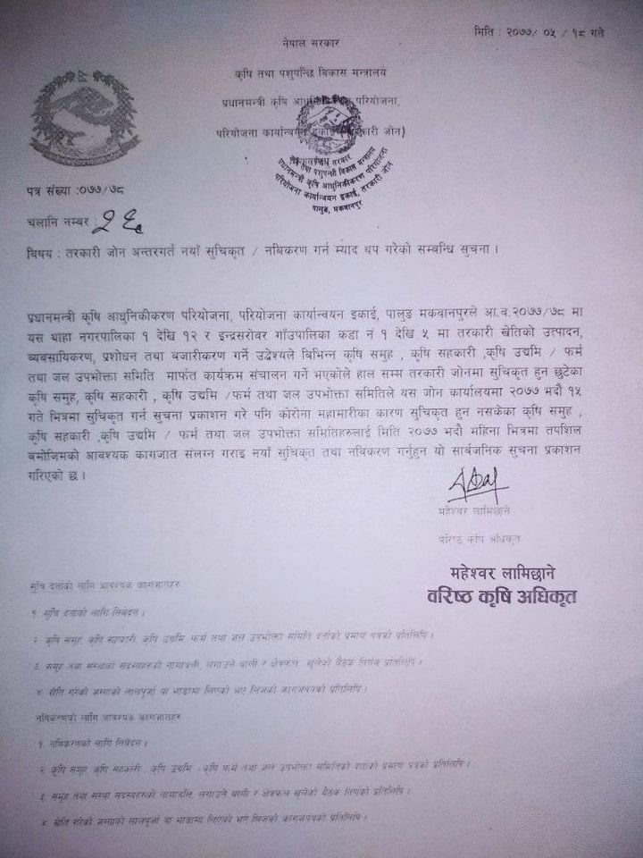 प्रधानमन्त्री कृषि आधुनीकीकरण परियोजना, परियोजना कार्यान्वयन इकाई (तरकारी जोन) थाहा नगरपालिका शिखरकोटले कृषक समूह, कृषि फर्म, कृषि सहकारी, कृषि उपभोक्ता समिति जल उपभोक्ता समिति सूचीकृत हुने म्याद थपेको छ ।