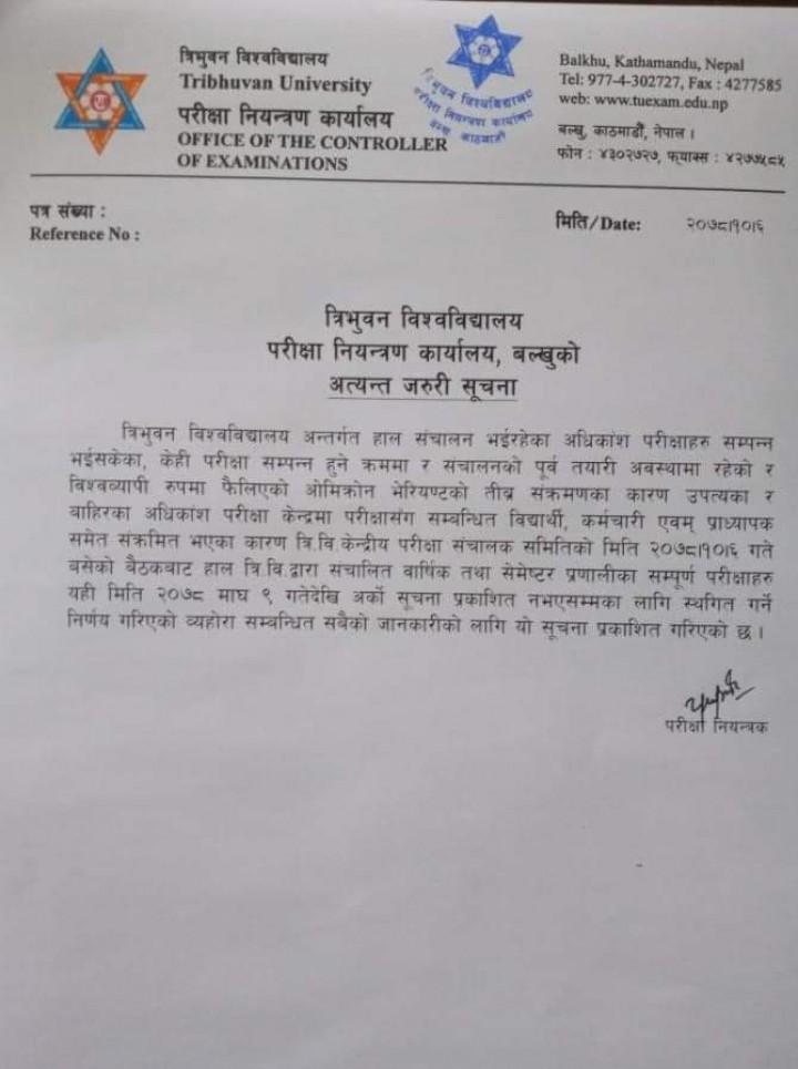 त्रिभुवन विश्वविद्यालयले अहिले सञ्चालन भइरहेका र आगामी दिनमा हुने सबै तहका परीक्षाहरू अनिश्चितकालका लागि स्थगित गरेको छ ।