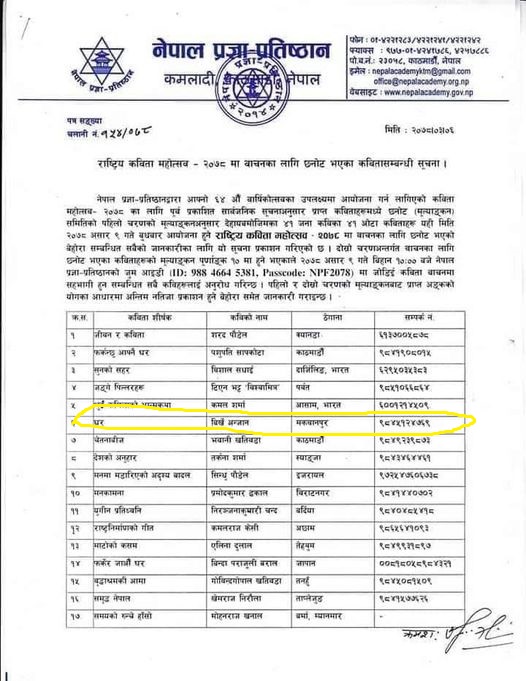 नेपाल प्रज्ञा प्रतिष्ठानले आफ्नो ६४ औँ वार्षिकोत्सवको अवसरमा राष्ट्रिय कविता महोत्सव–२०७८ आयोजना गर्न लागेको हो । सोका लागि प्रतिष्ठानले आह्वान गरेको सूचनाअनुसार ७६४ वटा कविताहरु प्राप्त भएकोमा सोमध्ये पहिलो चरणमा छनोट गरिएका ४१ कवितामध्ये बिर्खेको कविता परेको हो । प्रतिष्ठानले सार्वजनिक गरेको सूचीमा बिर्खेका कविता छ नम्बरमा छ ।