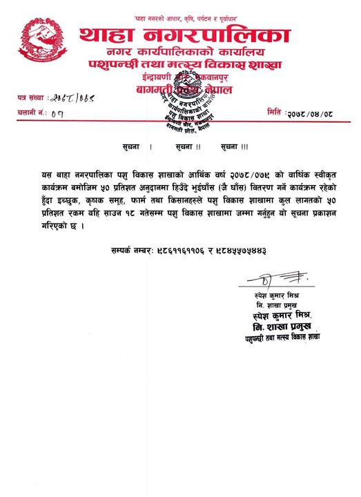 थाहा नगरपालिकाको पशु विकास शाखाले पशुपालक कृषकहरुलाई लक्षित गरी ५० प्रतिशत अनुदानमा कृषकहरुलाई भुईँघाँस वितरण गर्ने भएको छ ।