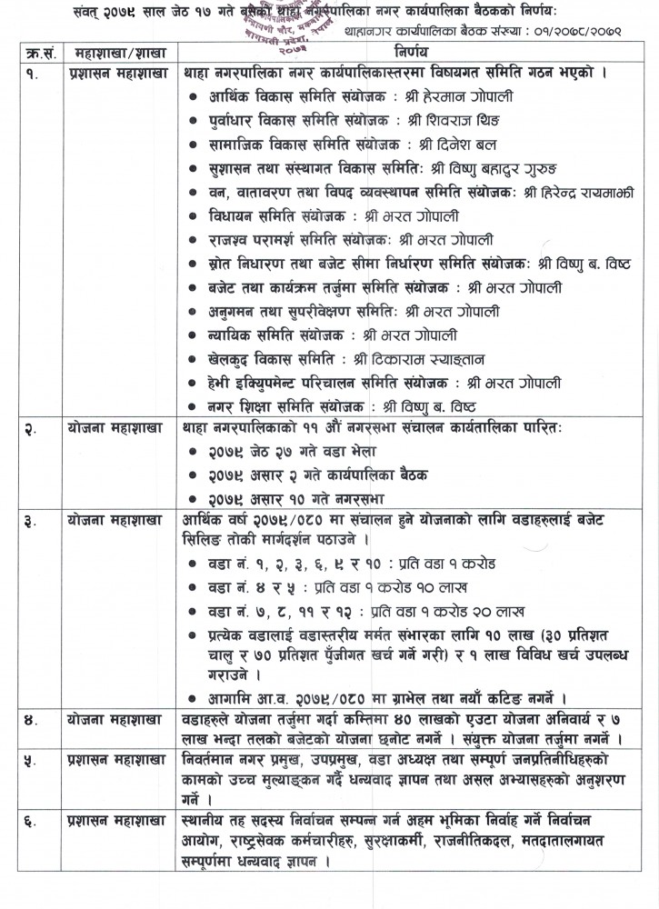 १७ जेठमा बसेकाे थाहा नगरकार्यपालिकाकाे पहिलाे बैठककाे निर्णय :