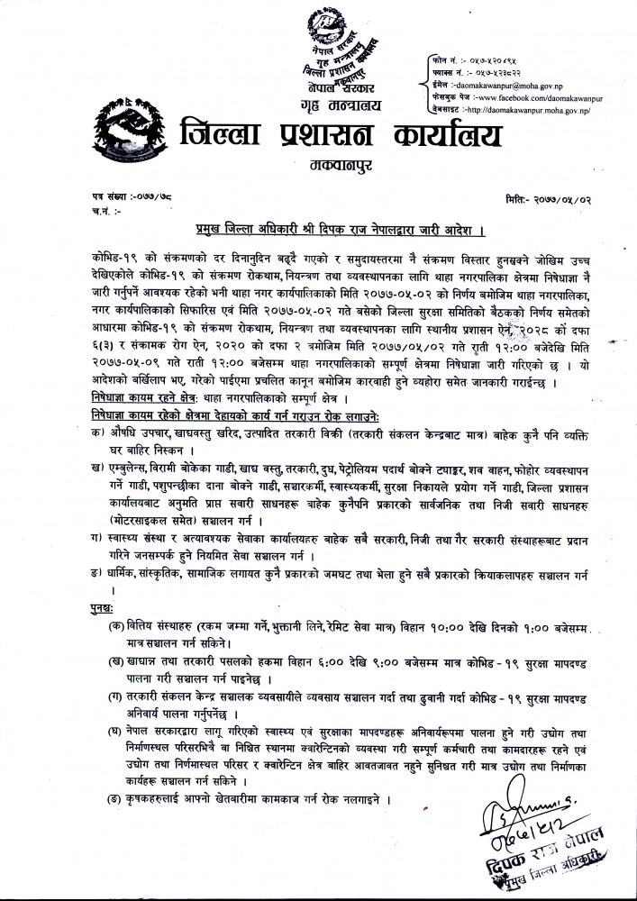 मकवानपुरका प्रमुख जिल्ला अधिकारी दिपकराज नेपालले जारी गरेको निषेधाज्ञा: