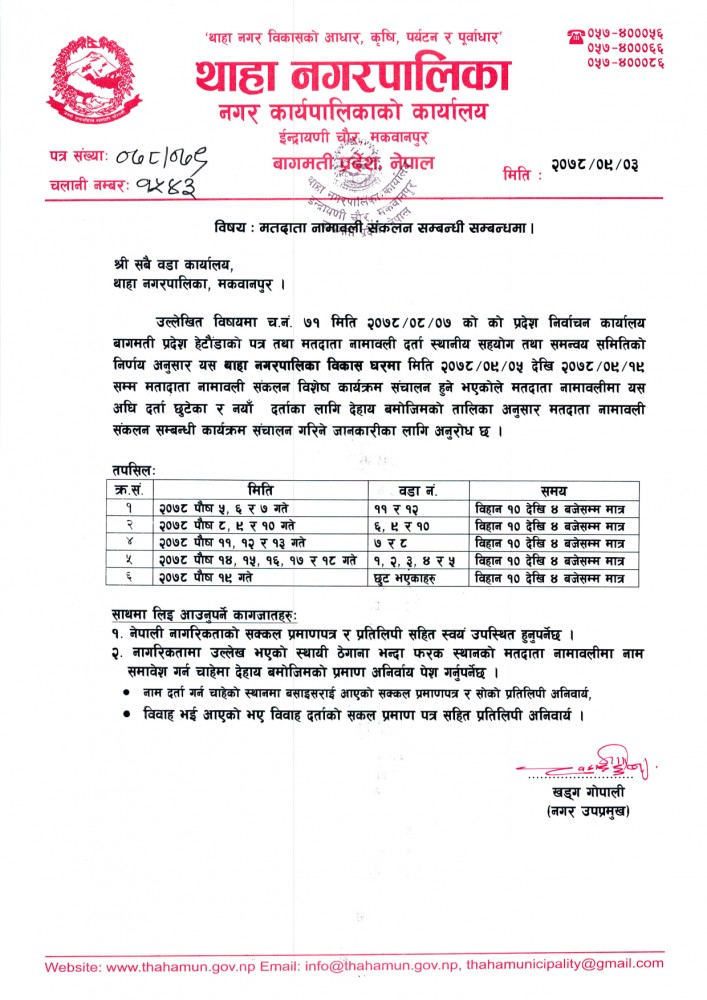थाहा नगरपालिकामा प्रदेश निर्वाचन कार्यालयको पत्र अनुसार ३ पुसमा स्थानीय सहयोग तथा समन्वय समितिको बैठक बसेर आगामी ५ पुसदेखि १९ पुससम्म थाहा नगरपालिका–३ शिखरकोटस्थित विकास घरबाट मतदाता नामावली सङ्कलन गर्ने निर्णय गरिएको हो ।