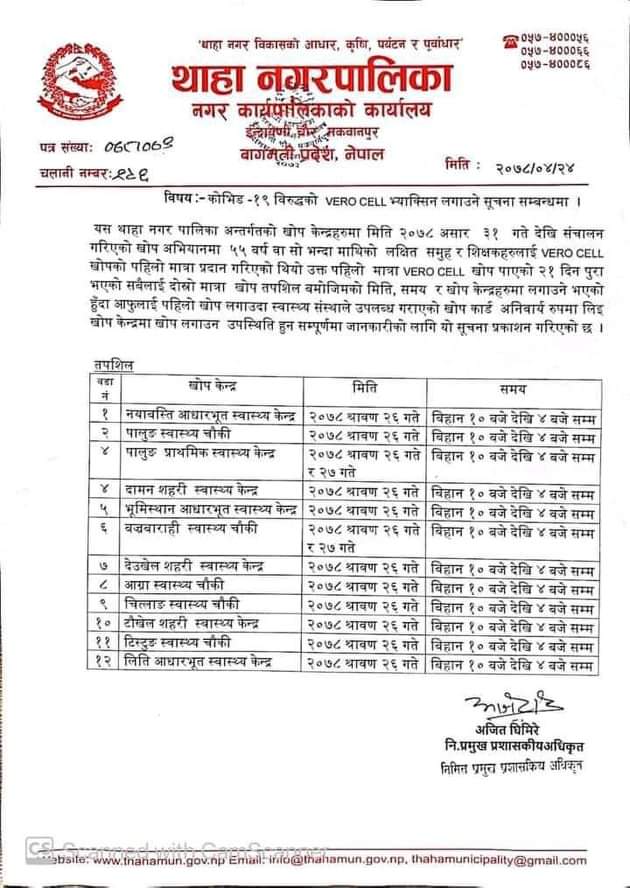 साे अवधिमा भेराेसिल खाेप लगाएकाे २१ दिन पूरा भएका थाहानगरका नागरिकलाई खाेप कार्डसहित आउन नगरपालिकाले सूचना जारी गरेकाे छ  ।