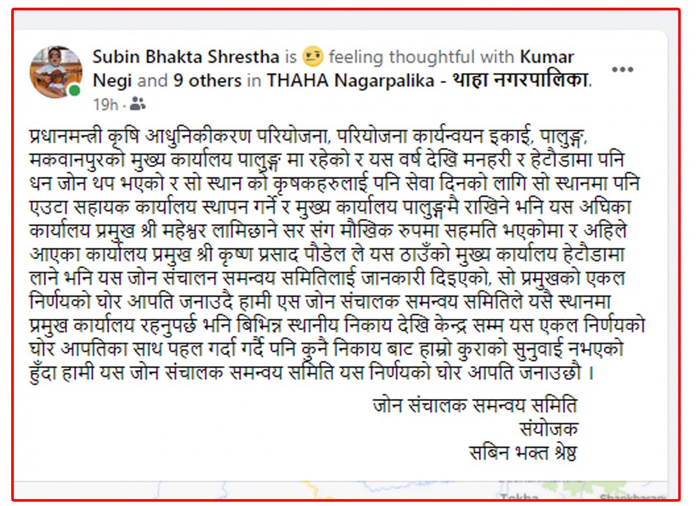 मकवानपुरको मनहरी र हेटौडाका केही वडामा धान जोन थप भएको उल्लेख गर्दै श्रेष्ठले त्यहाँ सम्पर्क कार्यालय स्थापना गरी पालुङमा रहेको मुख्य कार्यालयलाई निरन्तरता दिन माग गरेका छन् । विज्ञप्तमिा भनिएको छ–‘यस अघिका कार्यालय प्रमुख महेश्वर लामिछानेसंग भएको सहमति अनुसार पालुङको कार्यालयलाई निरन्तरता दिने भनिएकोमा हाल हाजिर भएका कार्यालय प्रमुख कृष्ण प्रसाद पौडेलले उक्त सहमती नमानी एकल निर्णय गरेकोमा जोन संचालक समन्वय समितिको घोर आपत्ति छ ।’ साविकको स्थानमै प्रमुख कार्यालय रहनुपर्छ भन्ने सावालमा अडिग हुन थाहा नगरपालिका तथा इन्द्रसरोवर गाउँपालिकालाई समेत विज्ञपती मार्फत आग्रह गरिएको छ ।  ‘कार्यालय प्रमुखको एकल निर्णयको विरोध गर्दै कार्यालय प्रमुखको कदमप्रति आपत्ति जनाउँदछौं’– विज्ञप्तीमा भनिएको छ ।