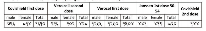 त्यसैगरी ४२८ जनाले भेरोसिल खोपको दोस्रो डोज लगाएका छन् । १२५५ पुरुष र १२५० महिला गरी २५०५ जनाले भेरोसिलको पहिलो खोप लगाएका छन् ।