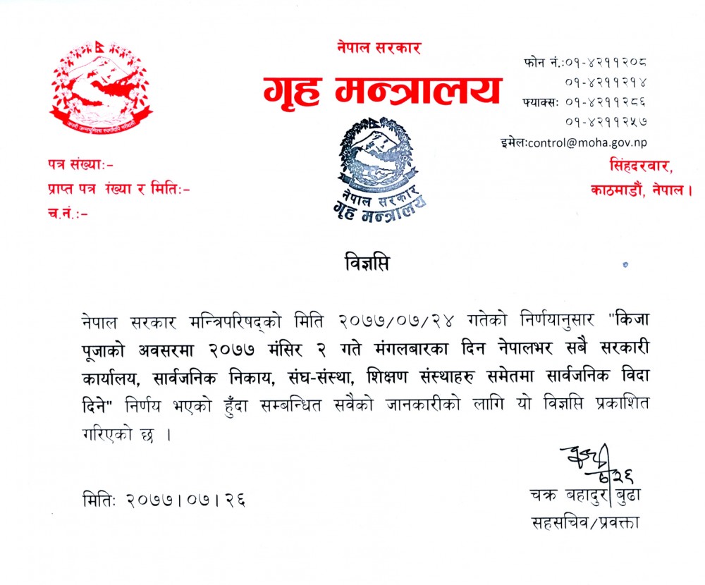 मंसिर २ गते सार्वजनिक विदा [हेर्नुहोस विज्ञप्ती सहित ]