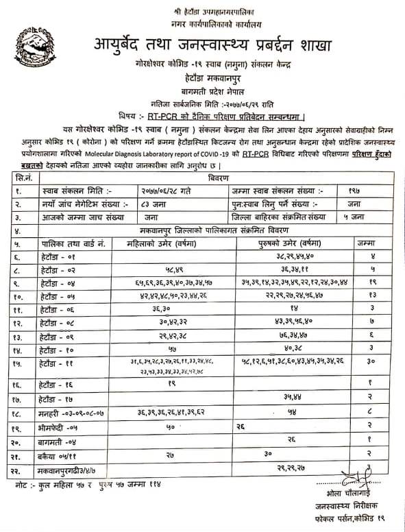 मकवानपुरमा बिहानै ११४ जनामा कोरोना पुष्टि (पूर्ण विवरणसहित)