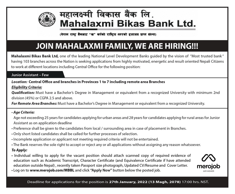 महालक्ष्मी विकास बैंक लिमिटेडले कर्मचारी माग गरेको छ । बैंकले केन्द्रीय कार्यालय तथा सात वटै प्रदेश कार्यालयका लागि जुनियर एसिस्टेन्ट पदको कर्मचारी माग गरिएको हो । उक्त पदका लागि बैंकले स्नातक तहमा म्यानेजमेन्ट विषय लिई कम्तिमा २.५ जिपीए प्राप्त कर्मचारी माग गरेको छ ।