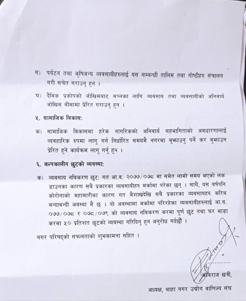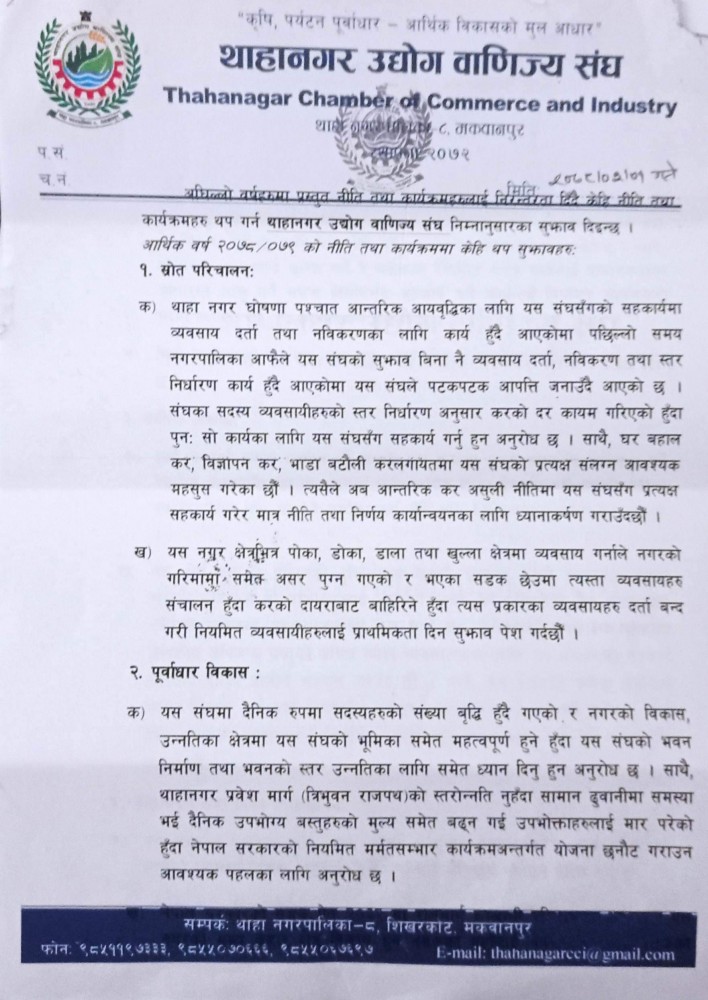 उद्योग बाणिज्य संघले थाहा नगरपालिकालाई १ असारमा सुझाव पत्र पेश गरेकाे हाे । अध्यक्ष खत्री र महासचिव सुरेन्द्रमान प्रधान नगरपालिका पुगेर नगर उपप्रमुख खड्गबहादुर गाेपालीलाई सुझाव पेश गरेका थिए ।