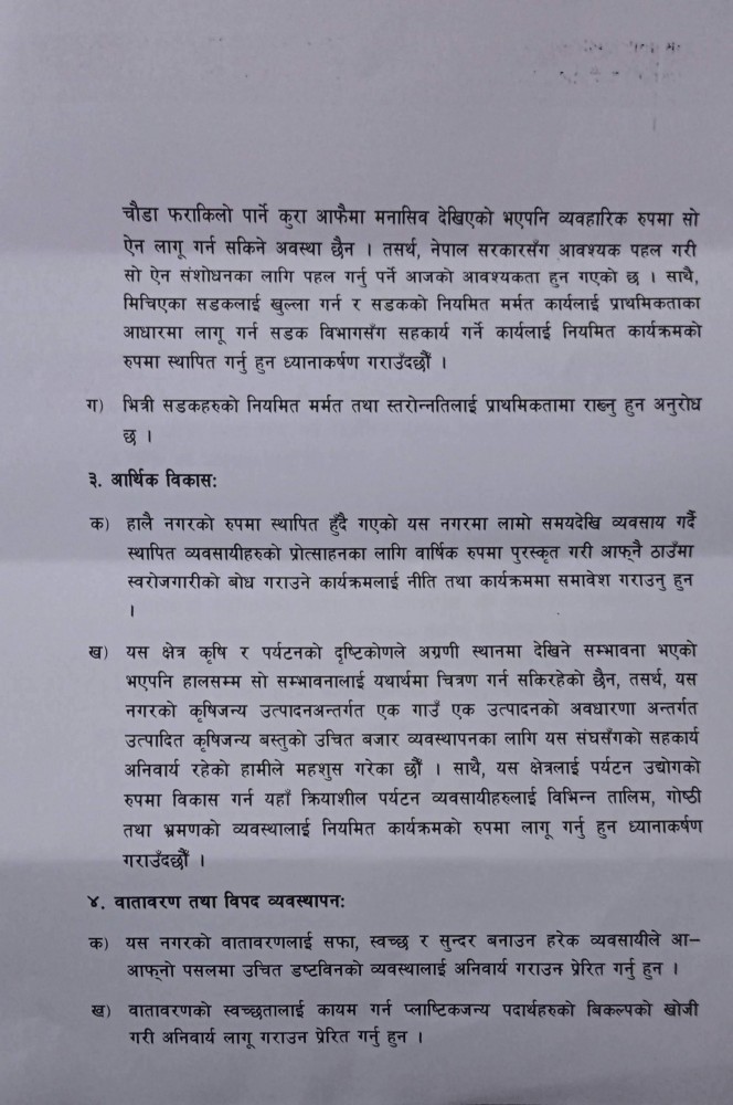 नगरपालिकाले अागामी अार्थिक वर्ष २०७८/७९ काे वार्षिक नीति तथा कार्यक्रमका लागि सुझाव मागेकाेमा व्यवसायीकाे हितमा यस्ताे सुझाव दिएकाे संघका अध्यक्ष कविराज खत्रीले बताए । 'अहिले लकडाउनकाे अवस्था छ,  ब्यवसाय बन्द मात्रै हाेइन, चाैपट छ, त्यसैले याे सुझाव पनि दिएका छाैँ', उनले भने ।