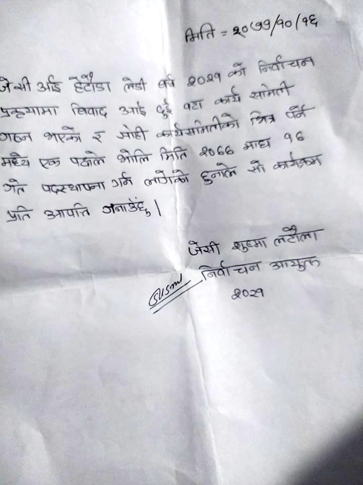 अन्जना श्रेष्ठ नेतृत्वको वर्ष २०२१ की निर्वाचन आयुक्त सुष्मा लटौंलाले १६ माघमा एक विज्ञप्ती जारी गर्दै अर्को पक्षको पदस्थापना प्रति आपत्ति जनाएकी हुन् । अर्को पक्षको पदस्थापना १७ माघमा हेटौंडामा हुने कार्यक्रम सार्वजनिक भएको छ ।